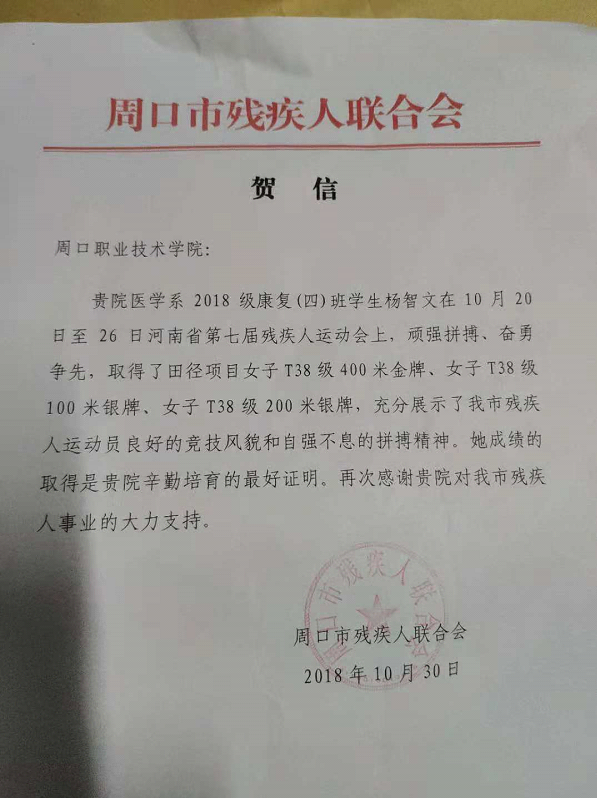 在刚刚结束的河南省第七届残疾人运动会上,医学院2018级大专康复4班学生杨智文代表周口市及金年会参赛,取得了女子组T38级100米银牌,200米银牌,400米金牌的佳绩,为我市及金年会争得了荣誉。受到市残联的通报佳奖。