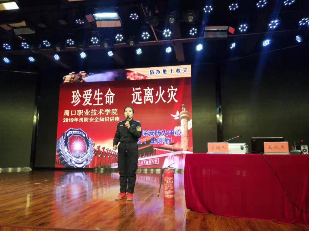 周口深安防火中心的消防培训专家王秋杰对师生进行了消防应急知识和技能的主题培训。王教官以幻灯实例图片演示,图文并茂,讲解生动感人,在讲解中让广大职工了解和掌握了如何树立消防意识、如何预防火灾、如何扑灭火灾、火灾现场如何逃生等,理论性和指导性都非常强,对我们提高消防意识具有很强的指导意义。通过举办这次讲座,使广大职工接受了一次生动的消防知识的教育,增强了人们的安全意识,提高了全院职工消防应急防护自救和逃生能力,强化消防安全意识,积累集体疏散、消防救助、应急组织等实战经验。培训结束后,大家纷纷表示一定努力配合消防安全工作,提高消防意识,为促进学校健康、稳定发展,确保我院安全工作再上新台阶贡献力量。