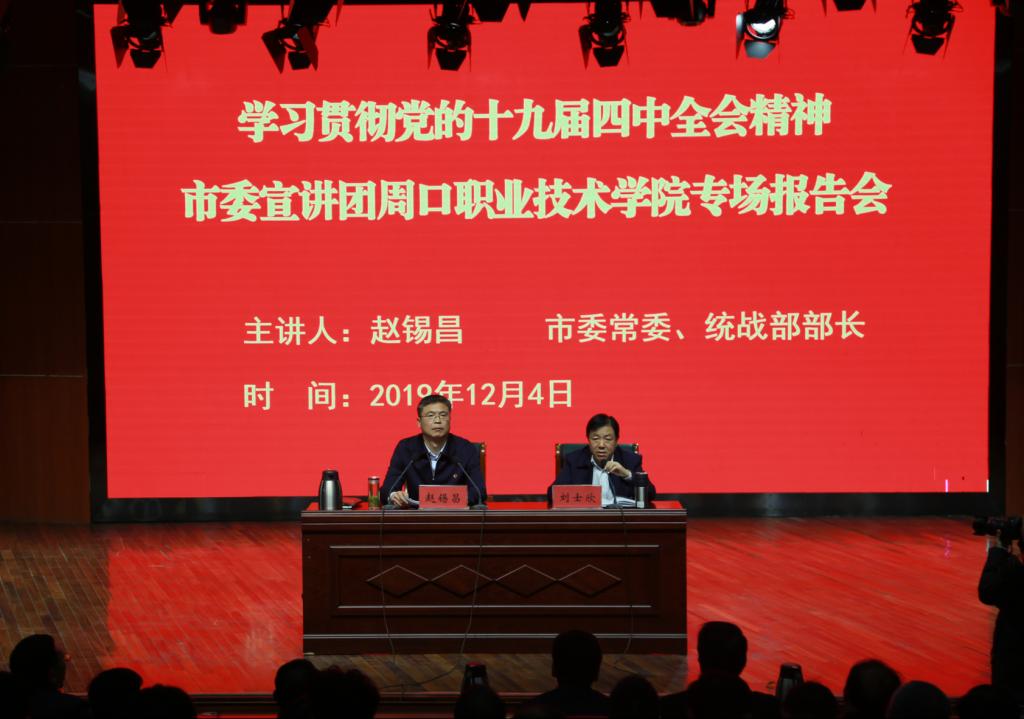 12月4日下午,学习贯彻党的十九届四中全会精神周口市委宣讲团金年会jinnianhuicom专场报告会在金年会开元校区砺德厅举行。市委常委、统战部部长赵锡昌同志作宣讲报告,全体在校校领导、处级以上干部、思想政治理论课教学部全体教师、学生党员代表共计850余人参加报告会,校党委书记刘士欣主持报告会。