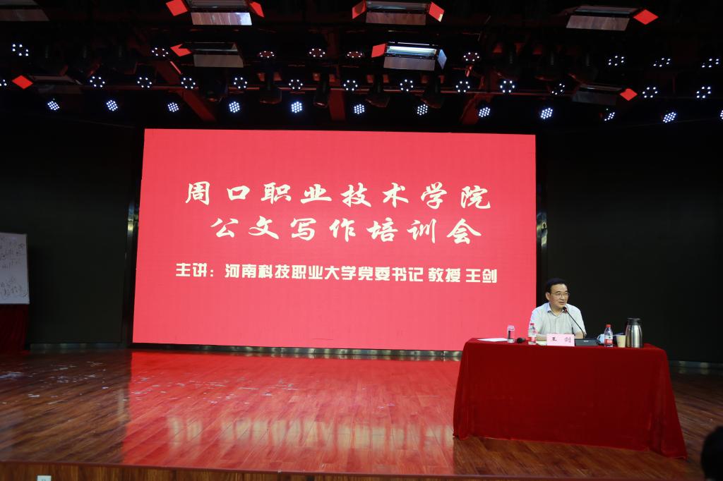 为提升学校治理整体效能,促进学校高质量发展,6月19号下午,金年会邀请河南科技职业大学党委书记、教授王剑为全校科级以上干部、行管人员作公文写作培训。培训会在学前与艺术教育学院演播厅举行。副校长许永安出席并主持培训会。