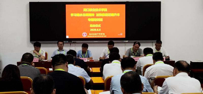 2020年8月4日-7日,金年会“弘扬南水北调精神、加快推进迁建升本”培训班按照课程安排,如期完成培训内容,在南北水调干部学院圆满结业。此次学习共培训学员51人,校党委书记刘士欣、校长李清臣,校领导赵振然、李庶泉、许永安、唐永宾及全体参训学员参加结业仪式,仪式由校长李清臣主持。