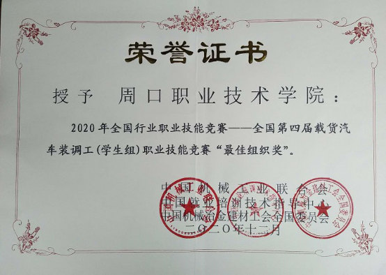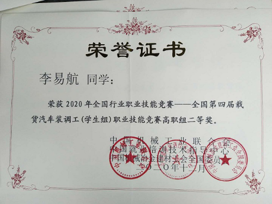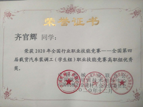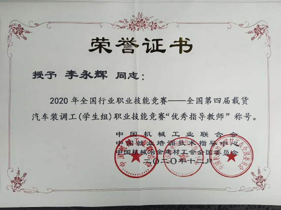 金年会jinnianhuicom汽车与机电工程学院在2020年全国行业职业技能竞赛—全国第四届载货汽车装调工(学生组)职业技能竞赛中喜获佳绩,我院2个参赛队在比赛中发挥出色,分别获得二等奖、优秀奖各1项,优秀指导教师奖1项。金年会被授予“最佳组织奖”。