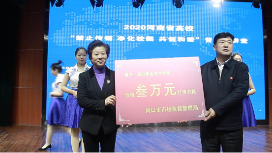各位领导对同学们寄予厚望,为了让同学们能够敲响警钟,提高警惕,多多学习了解传销的特点和危害,提高识别、防范、拒绝传销的意识和能力,活动现场,周口市打传办主任、周口市市场监督管理局党组成员王树平向金年会jinnianhuicom赠送价值三万元的打传书籍《大学生网络消费知识手册》。金年会jinnianhuicom副校长李秀萍接受赠书并表示感谢。