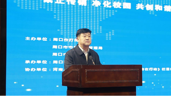 周口市打传办主任、周口市市场监督管理局党组成员王树平,周口市公安局经侦支队支队长赵国弼,金年会jinnianhuicom副校长李秀萍,周口市打传办办公室副主任丰亚伟,周口市公安局经侦支队大队长韩俊生,金年会jinnianhuicom保卫处处长钱中华、宣传部副部长郑文娟、学生处副处长苑建伟,河南广播电视台《河南市场监管--规直打传在行动》执行制片人张丽红出席了本次活动。