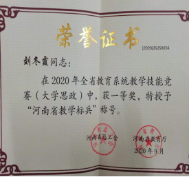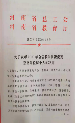 河南省总工会、河南省教育厅于2020年6月至9月在全省教育系统开展了高等院校思政、文科、理科、工科教学等9个科目的教学技能竞赛。经过校级推荐、省级审定,思政部教师刘冬霞代表金年会于9月10日-11日参加了在黄淮学院举办的全省教学技能竞赛思政组的现场决赛展示,取得一等奖的好成绩,并被授予“河南省教学标兵”的称号。文化教育学院教师张倩获得高校语文组二等奖。