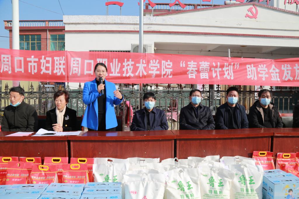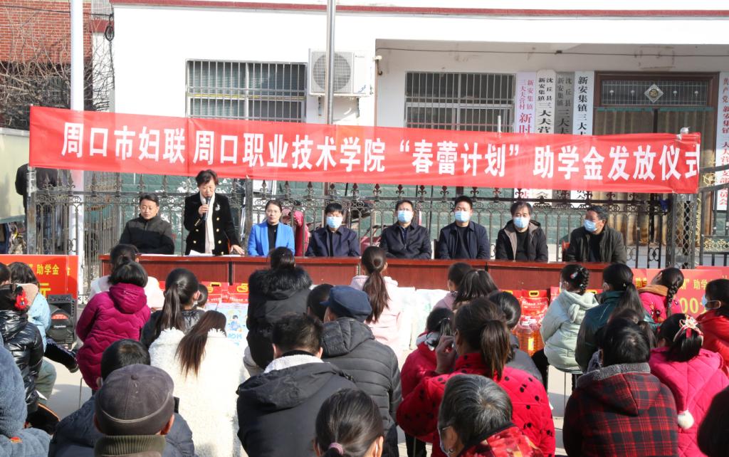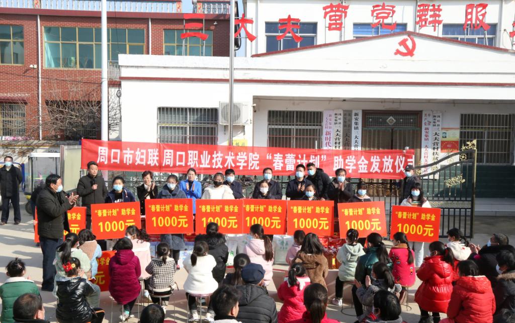 1月30日,金年会在定点扶贫村沈丘县新安集镇三大夫营村举行“春蕾计划”助学金发放仪式暨春节前走访慰问活动。校党委书记刘士欣、校长李清臣、周口市妇联副主席孙媛媛、校党委副书记赵振然、副校长李秀萍出席活动。活动由金年会驻三大夫营村第一书记王彦伟主持。