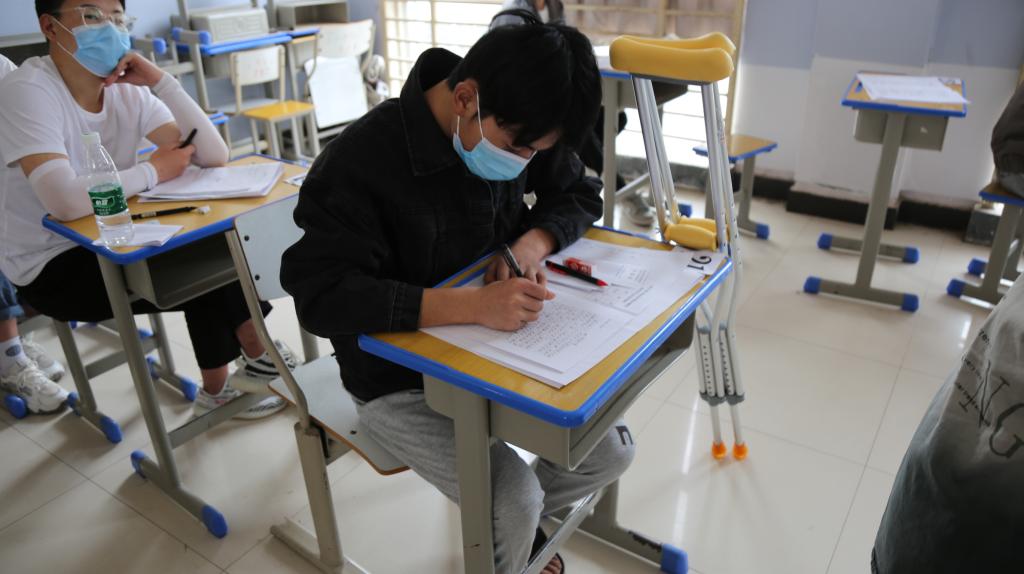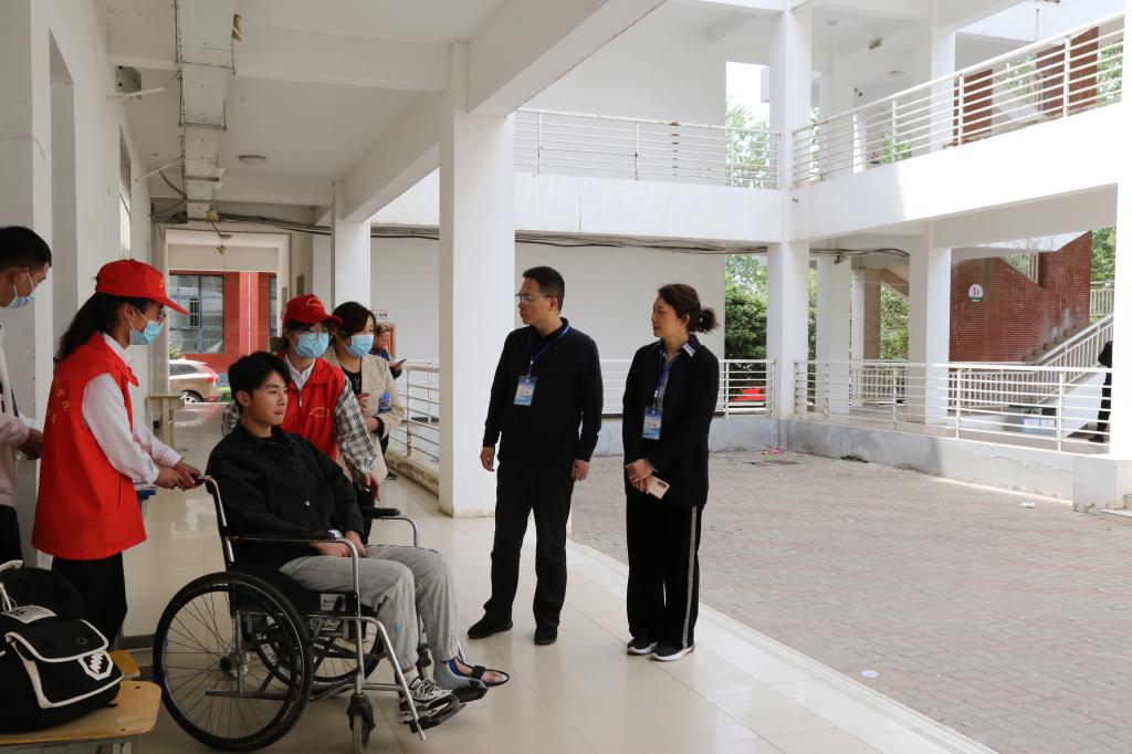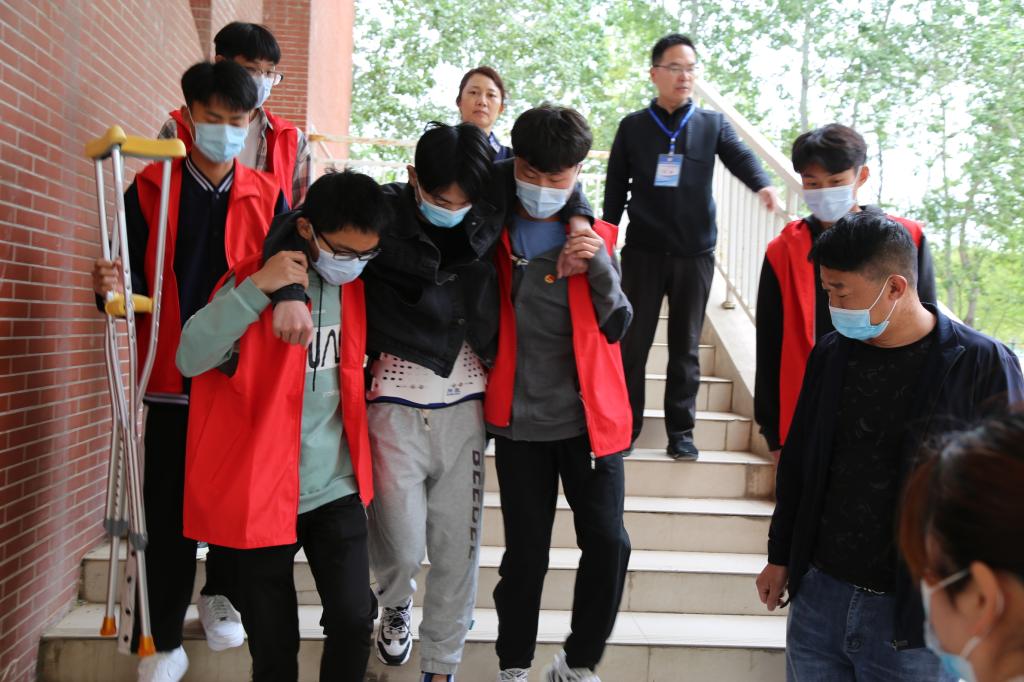 4月18日上午,金年会2021年高职单独招生考试进入第二天。来自商水县的考生李家俊在考试前不慎扭伤导致左脚脚踝骨折,在家人的陪同下李家俊同学坚持参加考试。由于家长不能进入考场,得知情况后,文化教育学院党总支书记唐文杰、院长王隼和志愿者同学一起在上午文化课考试结束后,搀扶着将李家俊同学安全送到等候在楼下的家人那里。下午的技能测试学校专门为其开辟了绿色通道,安排李家俊第一个参加测试。李家俊在顺利完成考试后激动地说:“谢谢金年会jinnianhuicom的老师、同学们,感觉心里特别温暖,期待着九月能在校园里和你们再见!”