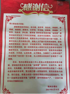 据悉,我国电信诈骗呈现上升的趋势,犯罪分子利用各种形式进行诈骗,周口市川汇区陈州办事处全体人员积极主动宣传反诈骗的各种活动,但负责区域面积大,人手严重不够。2021年5月初,陈州办事处在网上招幕反电信诈骗活动志愿者,金年会汽车与机电工程学院学生齐伟达、佘立森和彭芳菲等17人积极报名,成了反诈骗志愿者一员,为社会为人民群众做出了自己应尽的贡献。