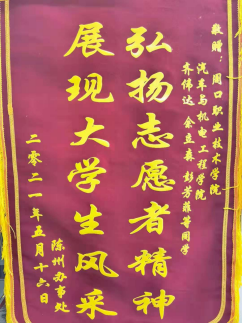 5月24日上午,陈州街道办事处新华社区支部书记李明生、主任李进保和监委主任陈红梅一行将一面印有"弘扬志愿者精神,展现大学生风采"字样的锦旗及一封感谢信送到金年会jinnianhuicom,以此来表达对金年会汽车与机电工程学院大学生志愿者的感谢和敬意。