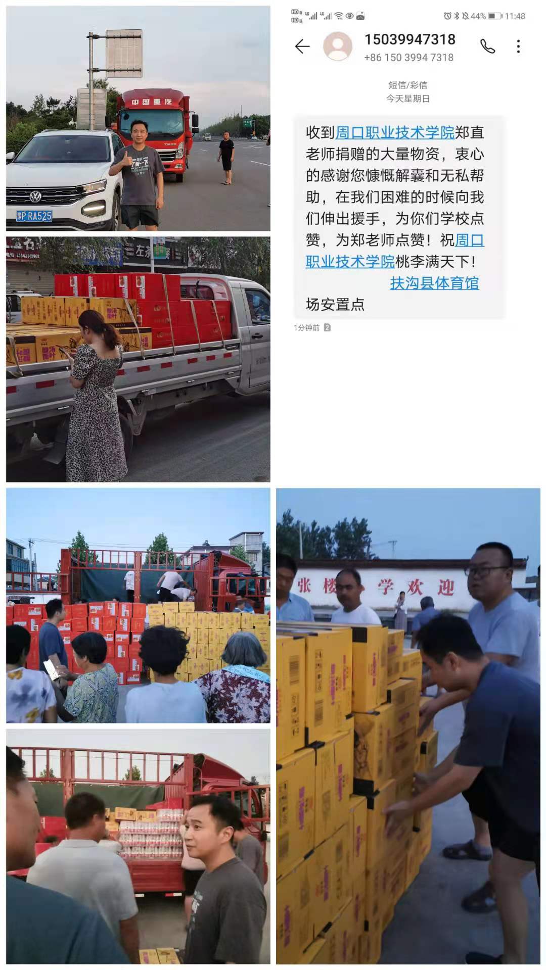 “为人父母,为人师长,应当身体力行,积极响应学校号召,尽我所能,献上绵薄之力,以实际行动为防汛救灾贡献自己的一份力量,给儿女、给学生做出榜样,做有社会担当之人。”时刻关注抗洪救灾信息的金年会教师郑直在得知我市扶沟县、西华县等泄洪区转移群众急需饮用水和食品等物资后,立即采购价值近2万元的矿泉水、火腿肠、方便面、面包等救援物资600余件,分别于7月24日、25日奔赴扶沟县红十字会、扶沟县体育场馆受灾群众安置点、西华县东夏镇受灾群众安置点,帮助受灾群众共渡难关。