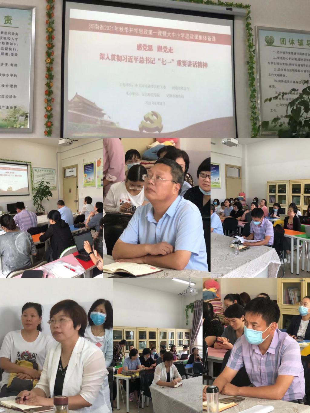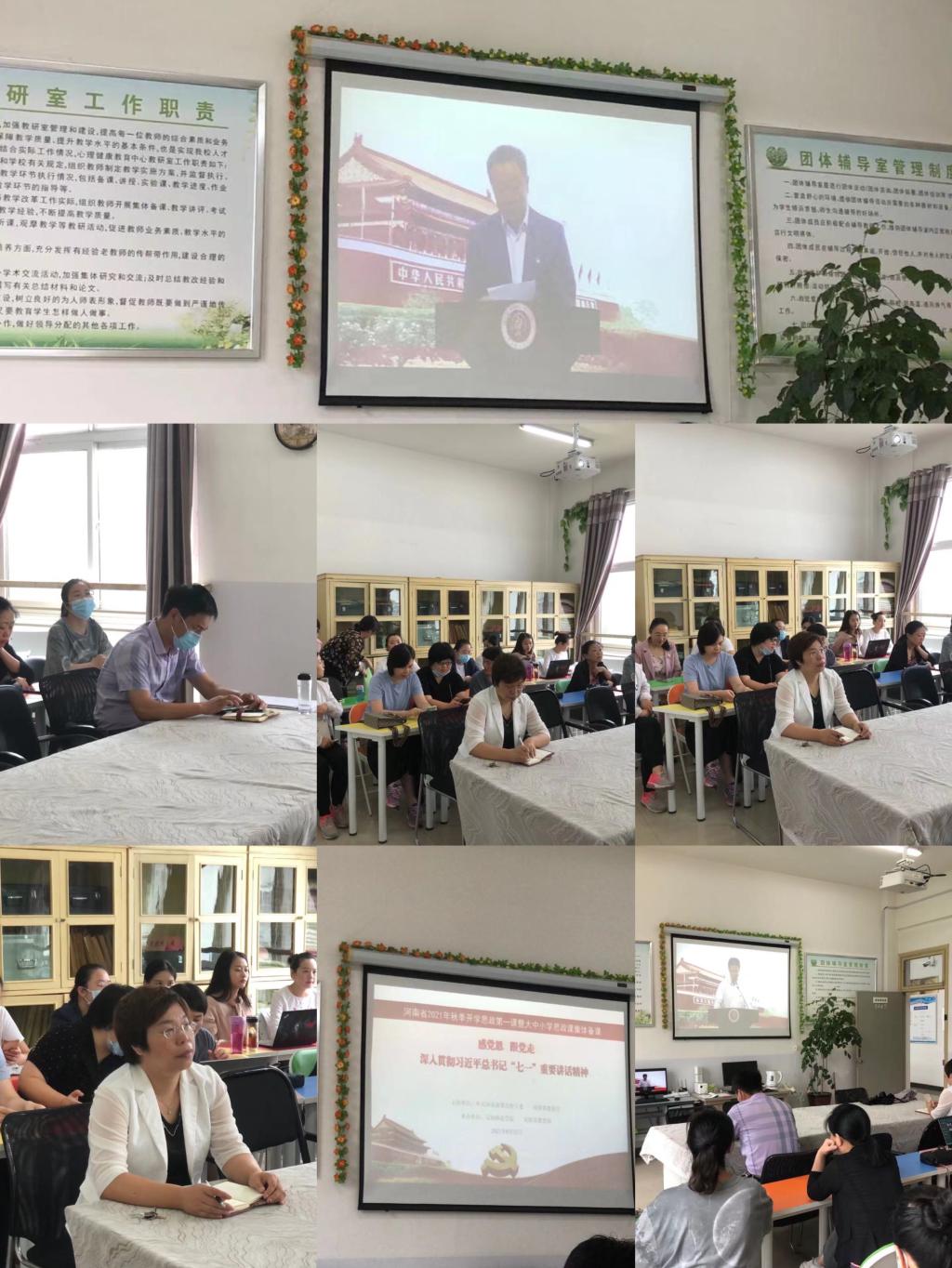8月30日和31日上午,副校长李明臣、思政部主任刘冬霞带领全体思政部教师在行政楼四楼团体心理咨询室收看了河南省2021年秋季开学思政第一课暨大中小学思政课集体备课直播。
