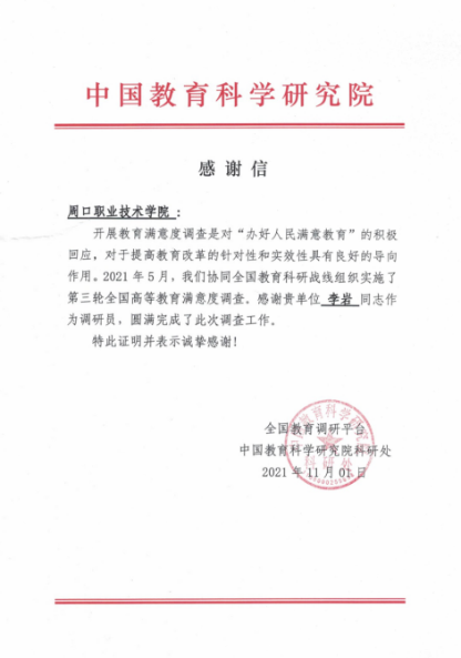 近日,金年会jinnianhuicom收到一封来自中国教育科学研究院的感谢信,信中对学校大力支持教育部组织开展的第三轮全国高等教育满意度调查工作表示感谢,对学校李岩同志的工作予以充分肯定和表扬。
