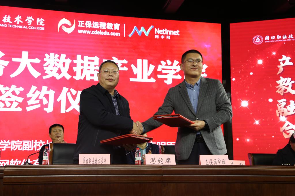 副校长李明臣、正保网中网大区总经理季金签订共建财务大数据产业学院合作协议暨教育部科技发展中心项目协议。