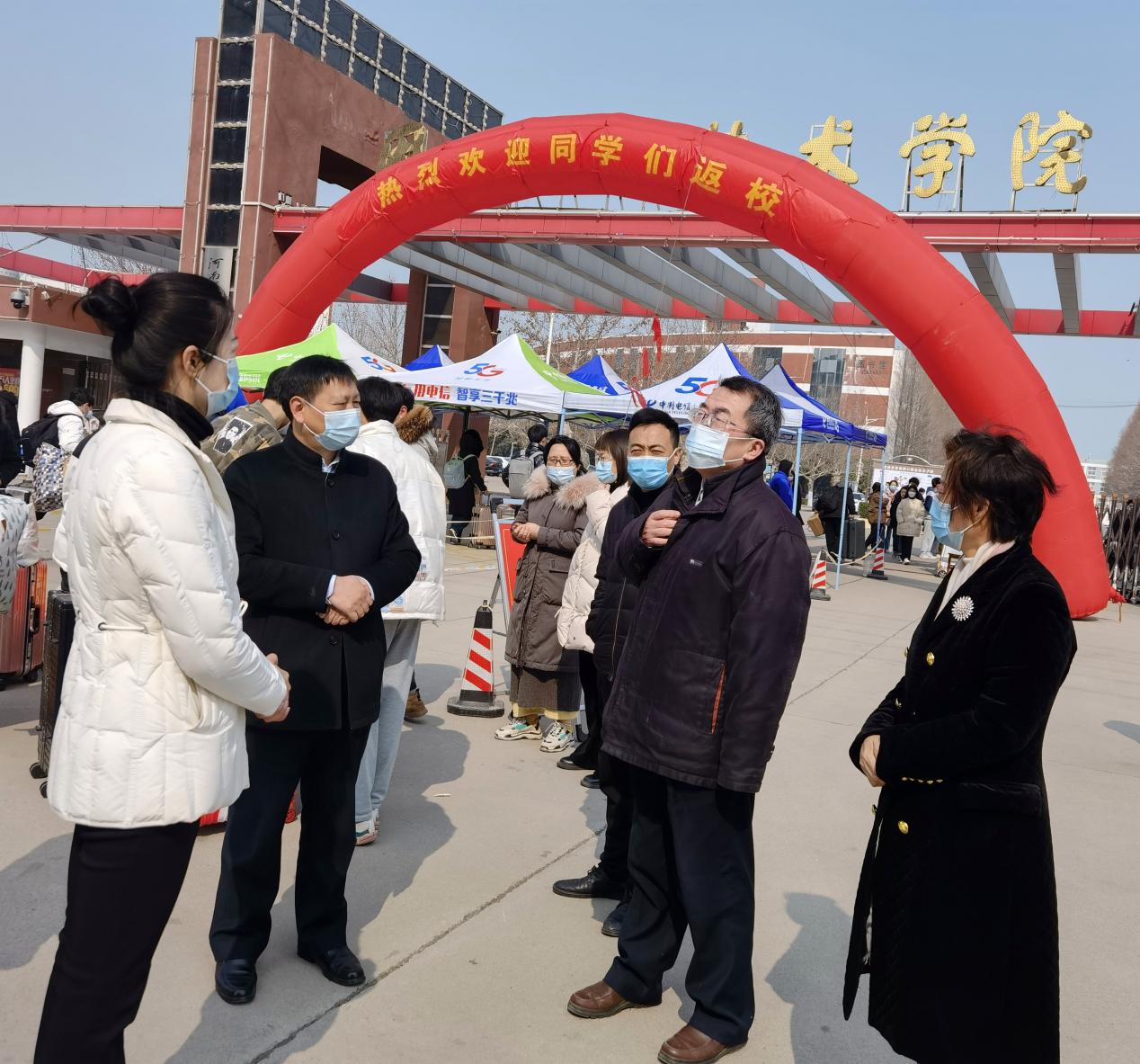根据金年会2022年春季开学工作安排和疫情防控工作要求,2月19日至20日,学生分批错峰错时返校。校长李清臣,党委副书记赵振然,副校长李秀萍带领相关部门工作人员,深入开元校区学生返校现场,实地检查指导学生开学报到和疫情防控工作并看望慰问返校学子和一线工作人员。