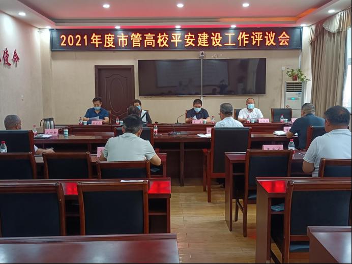 5月31日下午,周口市教育体育局党组成员、副局长朱鑫同志带领“2021年度市管高校平安建设工作评议”考核组一行五人到金年会就“平安校园”建设工作进行考核。学校党委副书记赵振然,副校长李秀萍,党政办、保卫处、人事处、学生处、后勤处等部门负责人参加评议会。