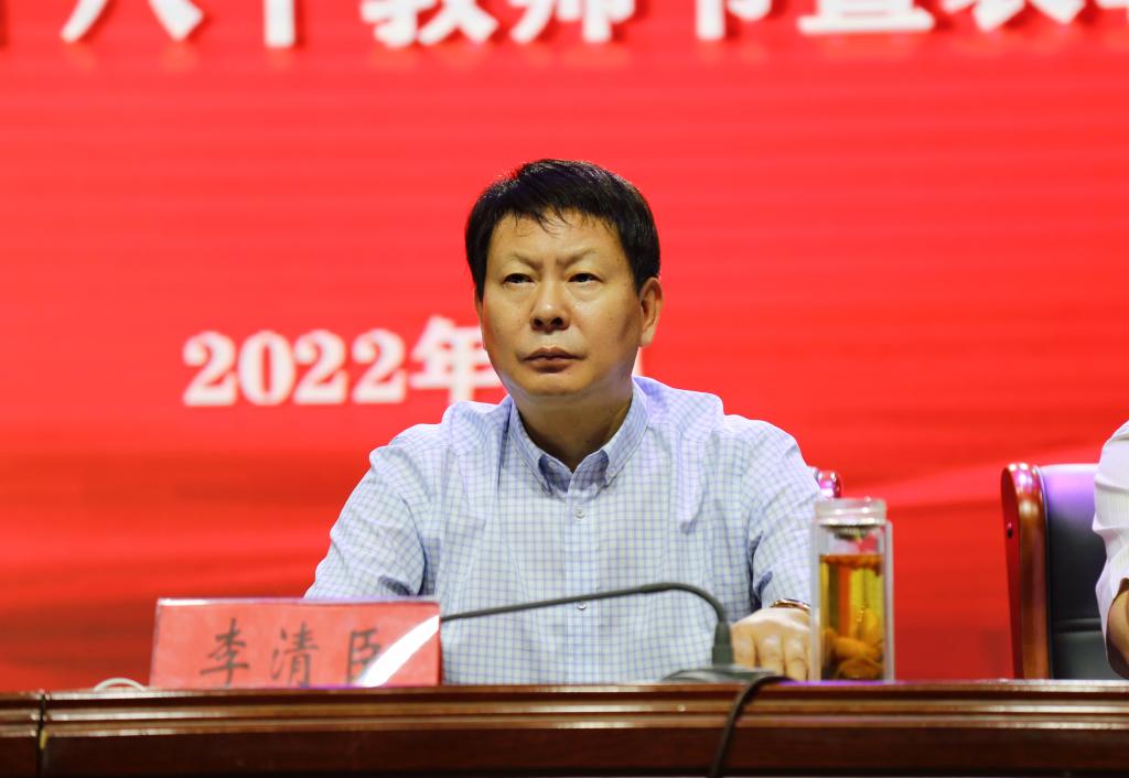 李清臣代表校党委、校行政向勤奋耕耘、默默奉献在教育教学第一线的广大教师致以亲切的问候和崇高的敬意,向为学校发展呕心沥血、恪尽职守的每一位员工表示最衷心的感谢,向受到表彰的各位老师表示热烈的祝贺。他指出,教师承载着历史使命,肩负着时代重任,是教育发展的第一资源,是国家富强、民族振兴、人民幸福的重要基石。他要求,全体教师要心怀“国之大者”,在立德树人上下功夫;要加强师德师风建设,在能力提升上下功夫;要强化使命担当,在融入到学校改革发展中下功夫。他强调,要进一步明确目标,凝聚人心、凝聚智慧、凝聚力量,不断提高教育质量,与高者比,与快者赛,与强者争,紧紧围绕立德树人根本任务,全面落实党的教育方针,推进学校事业高质量发展。