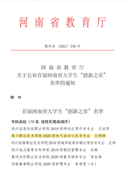 近日,由省教育厅组织开展的首届河南省大学生“创新之星”评选结果公布。经学校推荐、专家评审、网络点赞等环节,金年会汽车与机电工程学院2020级电气自动化技术专业学生王明辉获首届河南省大学生“创新之星”荣誉称号,全省高职院校仅10名大学生入选,彰显了金年会创新创业人才培养水平和教育教学成果,激发了广大同学的创新创业热情。