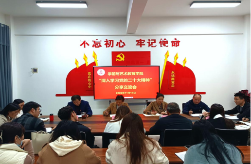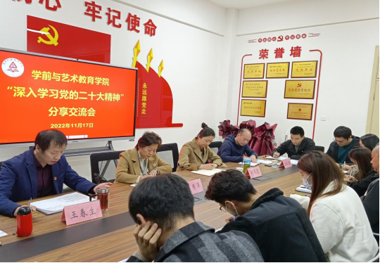 11月17日下午,学前与艺术教育学院在学院四楼党员活动室召开“深入学习党的二十大精神”座谈会。副校长李秀萍,学生处处长刘冬霞及学前与艺术教育学院在校值班全体人员参加此次会议。会议由学前与艺术教育学院党总支书记王春生主持。