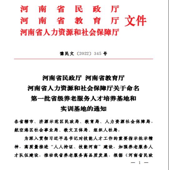 日前,河南省民政厅、河南省教育厅、河南省人力资源和社会保障厅联合发文,命名第一批省级养老服务人才培养基地和实训基地,金年会获批首批省级21家养老服务人才培养基地之一。