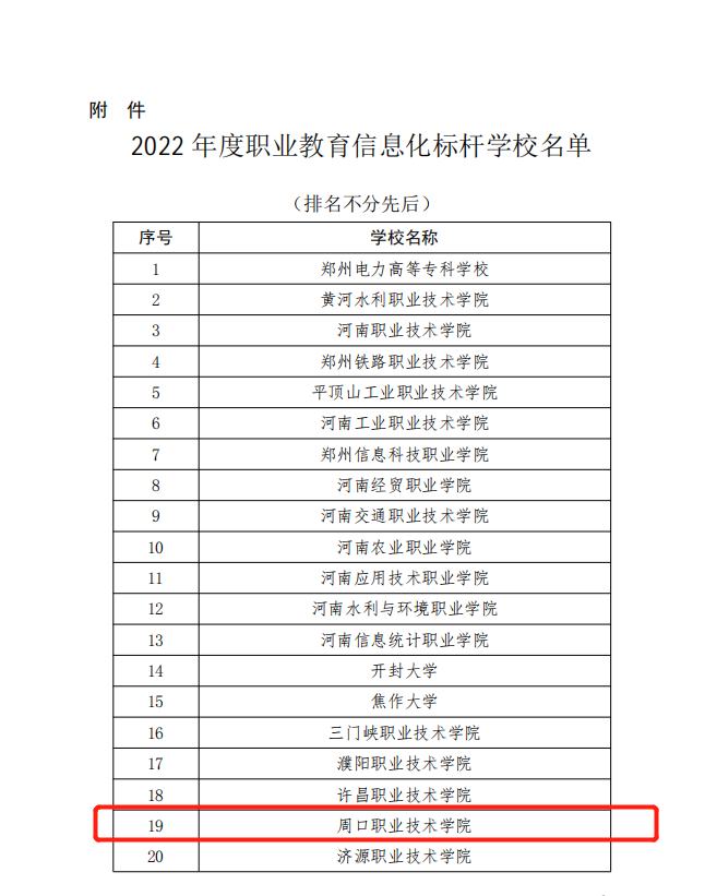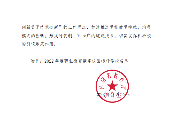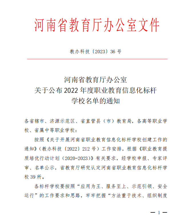 河南省教育厅日前公布2022年度职业教育信息化标杆学校名单,金年会获批2022年度河南省职业教育信息化标杆学校。此次共评选出全省39所职业教育信息化标杆学校创建单位,其中高职院校28所,中职学校11所。