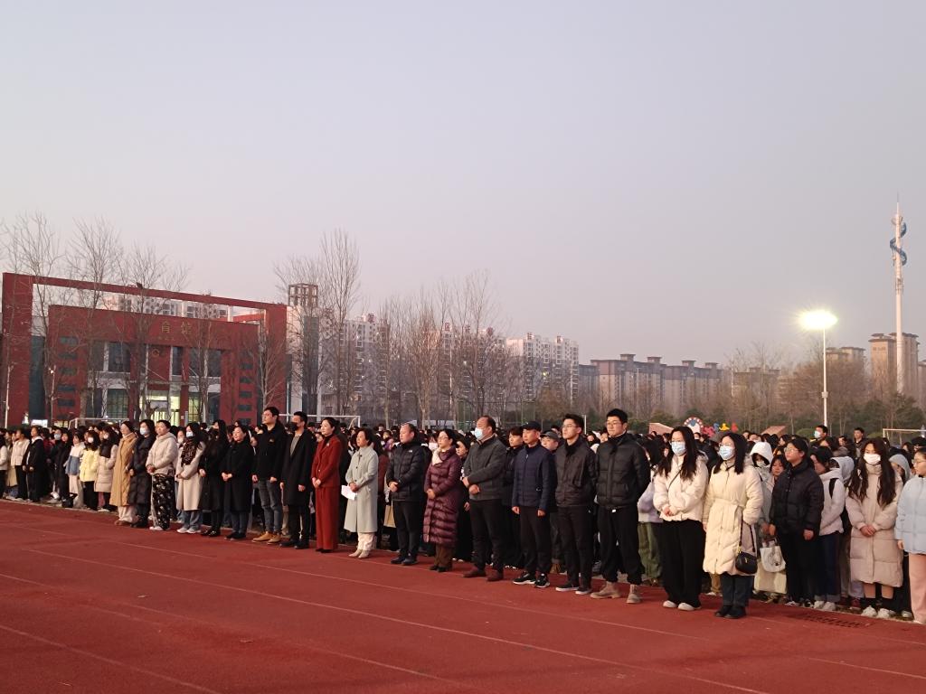 伴随着庄严雄壮的《义勇军进行曲》,鲜艳的五星红旗在晨光中冉冉升起,在场的每一位师生面向国旗行注目礼。