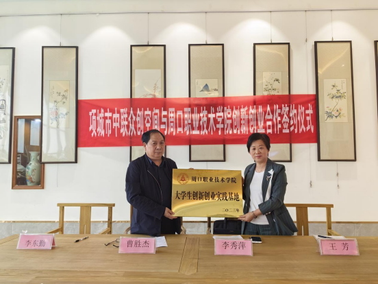 李秀萍和曹胜杰分别代表双方签订共建大学生创新创业实践基地协议书,共同为大学生创新创业实践(共建)基地揭牌。