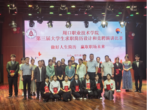 张华珍对本次比赛进行点评,对同学们的精彩表现给予了高度评价,对选手们的求职简历和竞聘演讲提出了具体性指导建议。最后,李秀萍、全体评委老师和在场的二级学院党总支书记为获奖选手和部门颁奖并合影留念。