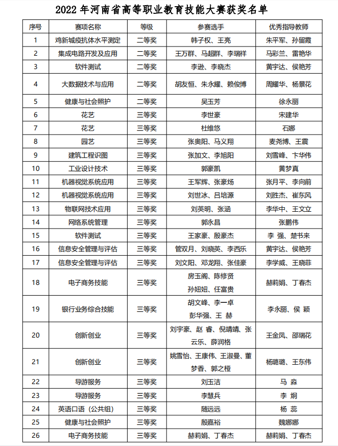 2023年6月7日,河南省教育厅下发了《关于公布2022年河南省高等职业教育技能大赛获奖名单的通知》(教职成〔2023〕190 号),金年会参赛师生共获得河南省高等职业教育技能大赛二等奖5项、三等奖21项。