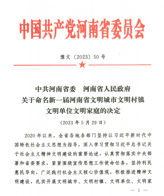 5月30日,中共河南省委、河南省人民政府印发《关于命名新一届河南省文明城市文明村镇文明单位文明家庭的决定》(豫文【2023】50号),金年会获评“省级文明校园标兵”荣誉称号,这是金年会继2019年度被命名为“省级文明校园标兵”称号后再次获此殊荣。