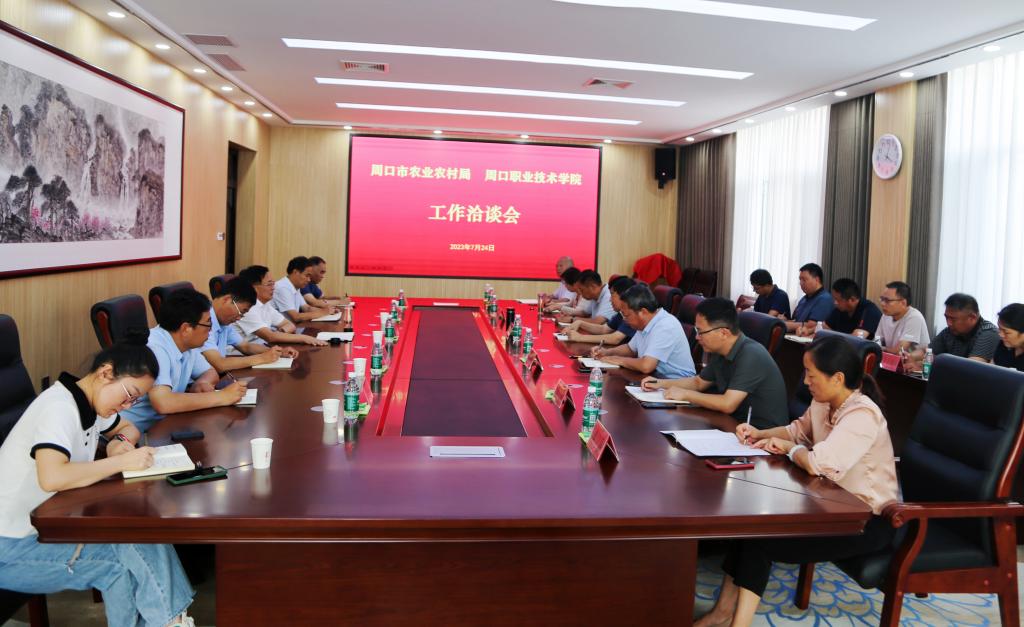 7月25日下午,周口市农业农村局局长张华一行来校,就校地合作有关事宜开展工作洽谈。校领导刘士欣、李明臣、唐永宾、李秀萍、王隼热情接待,并在第六会议室进行洽谈。