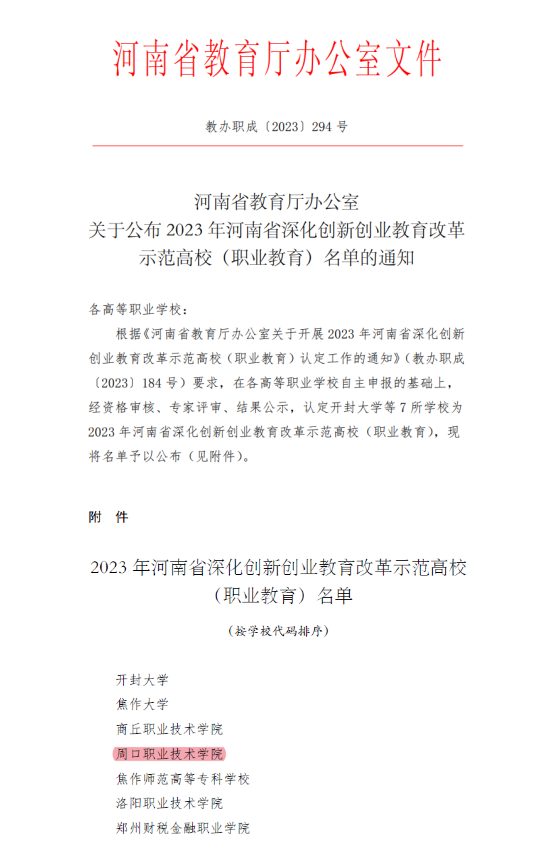 8月21日,河南省教育厅下发《河南省教育厅办公室关于公布2023年河南省深化创新创业教育改革示范高校(职业教育)名单的通知》(教办职成〔2023〕294号),全省共7所高职院校入选,金年会位列其中。