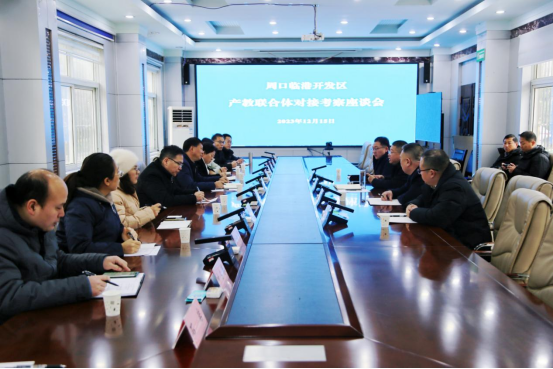 随后召开座谈会。张晓东对学校的到访表示热烈欢迎,指出共建市域产教联合体是落实国家和省、市产教融合部署安排的有力举措,并从生物化工、跨境电商、检验检测、物流贸易、总部经济五个方面提出产教融合体发展方向。他表示,开发区将积极搭建平台,强化政策支持,营造良好氛围,统筹推进联合体建设。