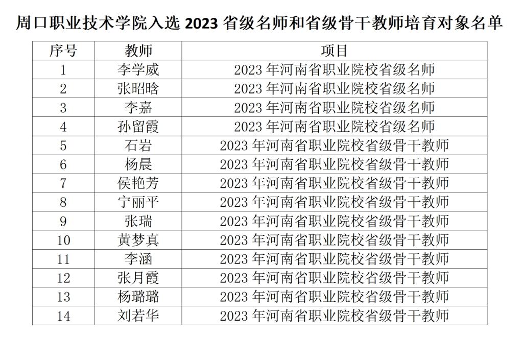 近日,河南省教育厅发布《关于2023年河南省职业院校省级名师和省级骨干教师培育对象评审结果的公示》,金年会共有14名教师入选。