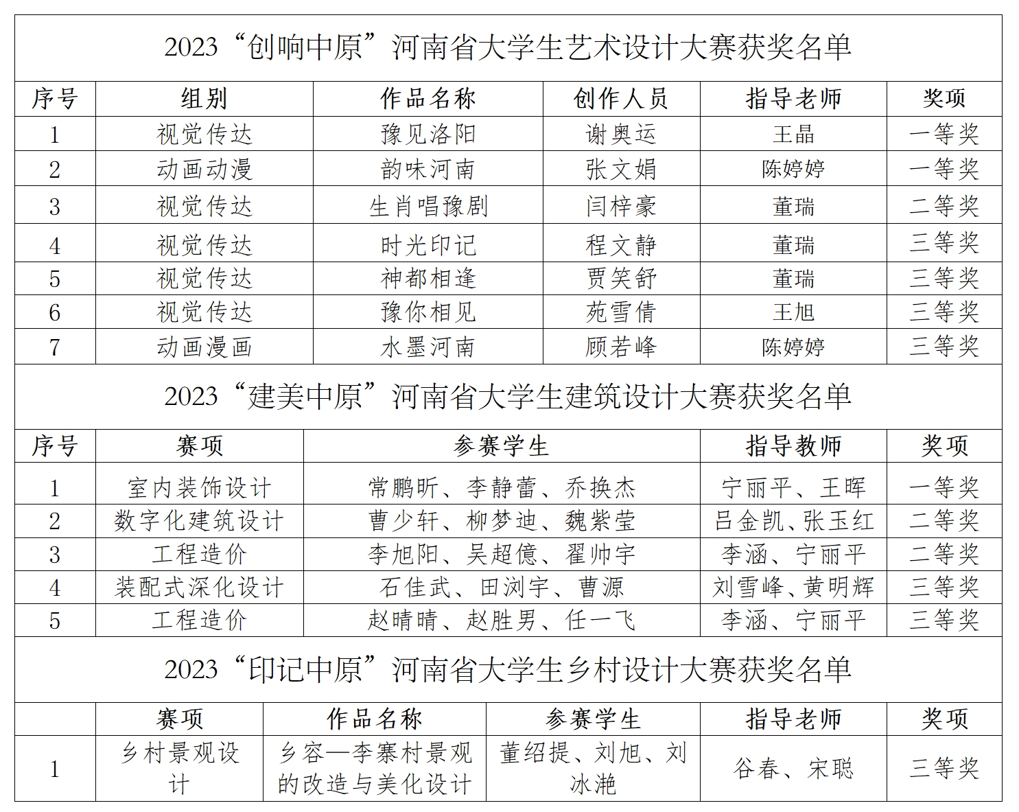 近日,河南省教育厅公布2023“设计河南”系列大学生学科竞赛获奖名单,金年会共有13个团队或个人获奖,其中一等奖3项,二等奖3项,三等奖7项。