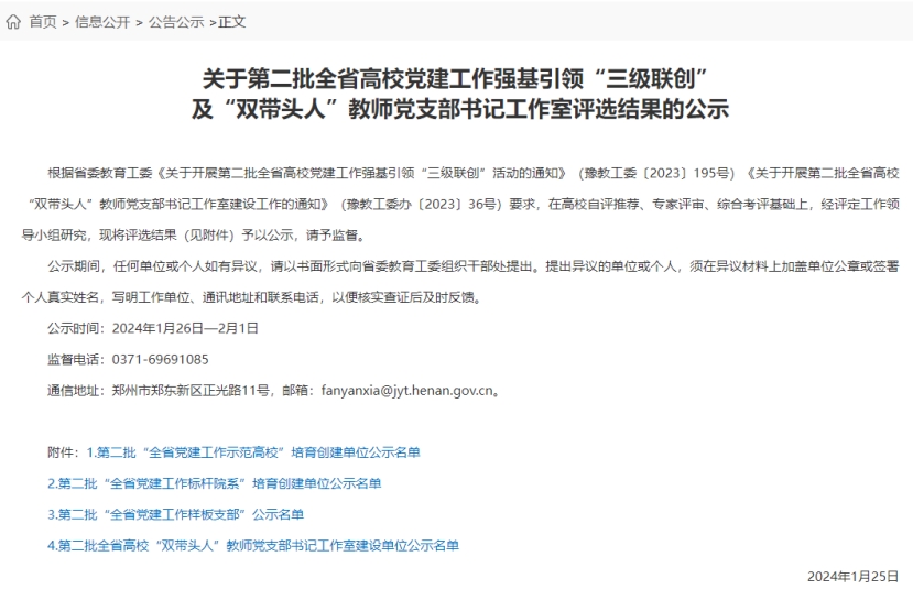 根据省委教育工委《关于开展第二批全省高校党建工作强基引领“三级联创”活动的通知》(豫教工委[2023]195号)和《关于开展第二批全省高校“双带头人”教师党支部书记工作室建设工作的通知》(豫教工委办[2023]36号)要求,本次评选在高校自评推荐、专家评审、综合考评基础上,经评定工作领导小组研究决定。
