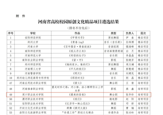 近日,中共河南省委教育工委、河南省教育厅下发《关于公布河南省高校校园原创文化精品项目遴选结果的通知》,金年会护理学院申报的原创舞台剧《最美的答卷》被评为河南省高校校园原创文化培育项目。