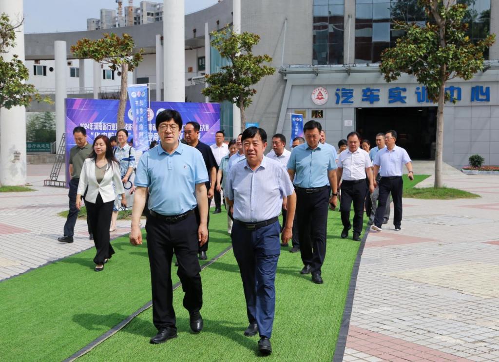 考察组一行实地巡视了2024年河南省绿色制造应用技术职业技能大赛焊接设备装配调试工赛项比赛现场,参观走访了学校汽车实训中心、植物新型快繁技术研发中心等教学实训场所。每到一处,郑邦山认真听取汇报,详细询问学校产教融合、人才培养等相关情况。在植物新型快繁技术研发中心考察时,郑邦山对该项技术给予高度评价,认为其具有重要的理论研究价值和巨大的市场应用前景。