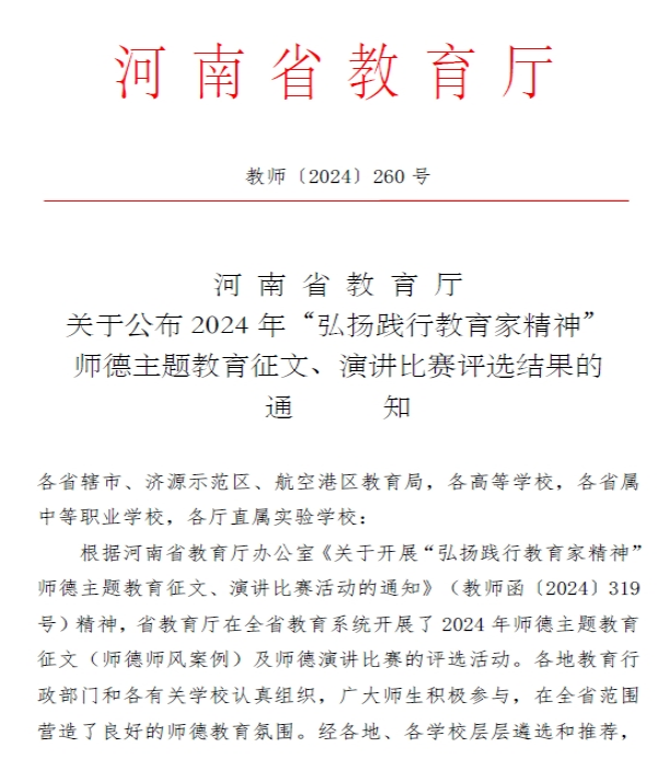 近日,河南省教育厅2024年“弘扬践行教育家精神”师德主题教育征文、演讲比赛评选结果公布,金年会教师在征文活动中再获佳绩,斩获一等奖1项、二等奖1项、三等奖2项。