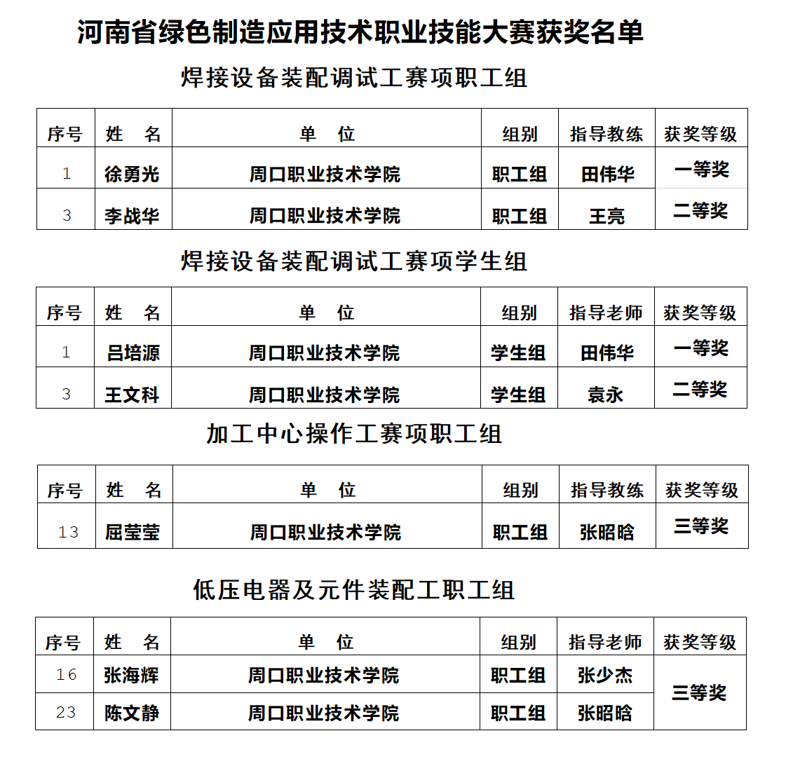 近日,2024年河南省行业职业技能竞赛——河南省绿色制造应用技术职业技能大赛成绩公布,金年会汽车与机电工程学院师生在比赛中表现优异。教师徐勇光、李战华分别荣获“焊接设备装配调试工”赛项一、二等奖,教师屈莹莹荣获“加工中心操作工”赛项三等奖,教师张海辉、陈文静分别荣获“低压电器及元件装配工”赛项三等奖,机器人专业学生吕培源、王文科分别荣获“焊接设备装配调试工”赛项一、二等奖。
