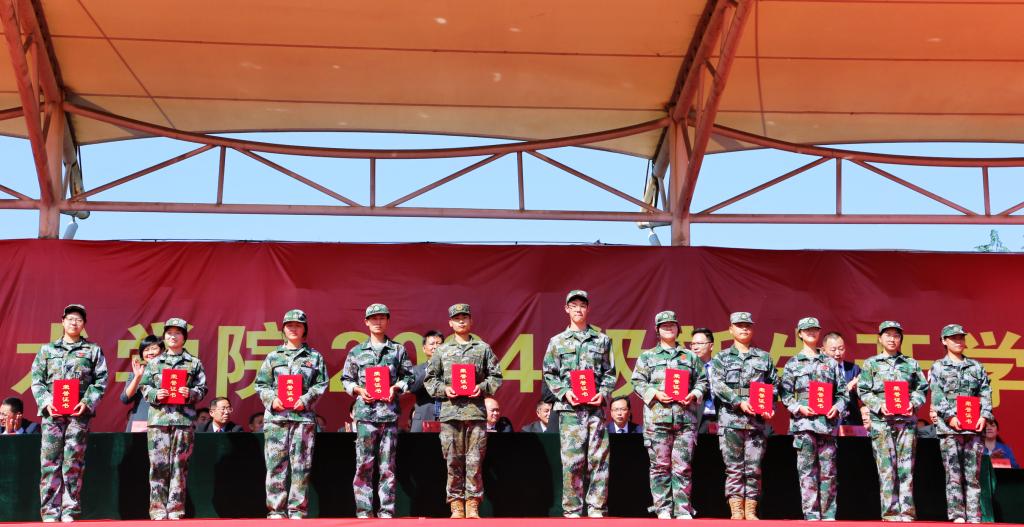 党委副书记、工会主席郭汝礼宣读《关于表彰2024级学生军训工作先进集体、先进工作者和优秀学员的决定》,校领导为先进集体和先进个人颁奖。
