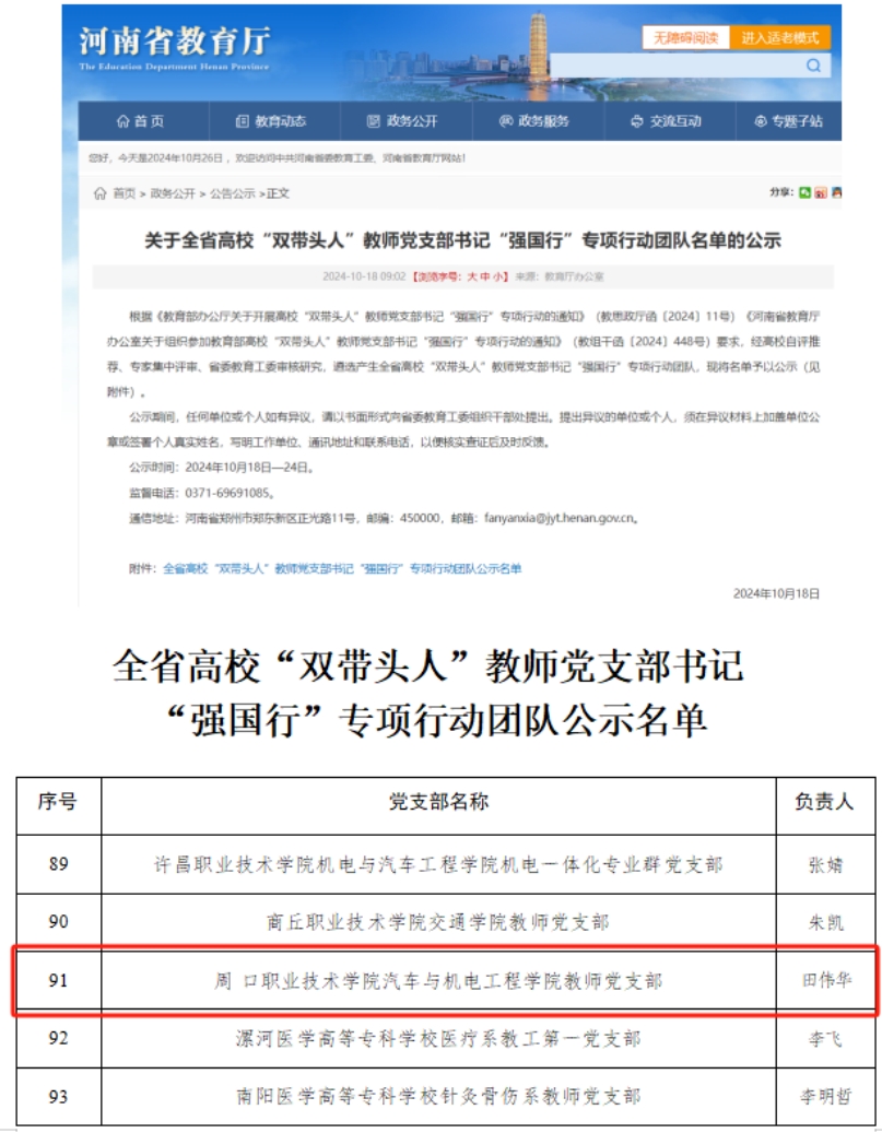 近日,河南省教育厅公布全省高校“双带头人”教师党支部书记“强国行”专项行动团队名单,金年会汽车与机电工程学院教师党支部成功入选该项目团队。