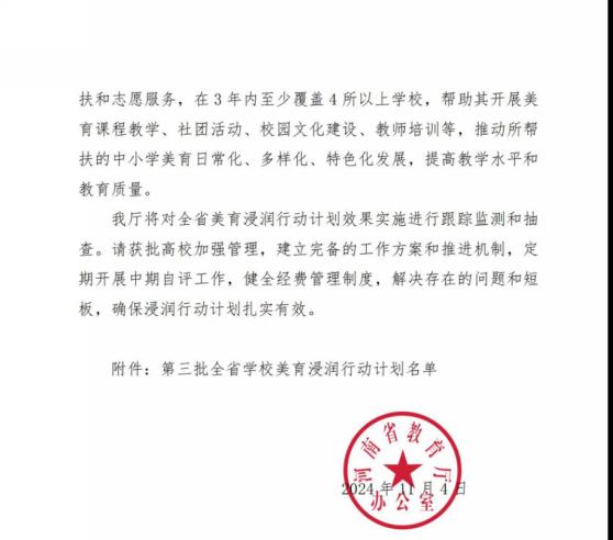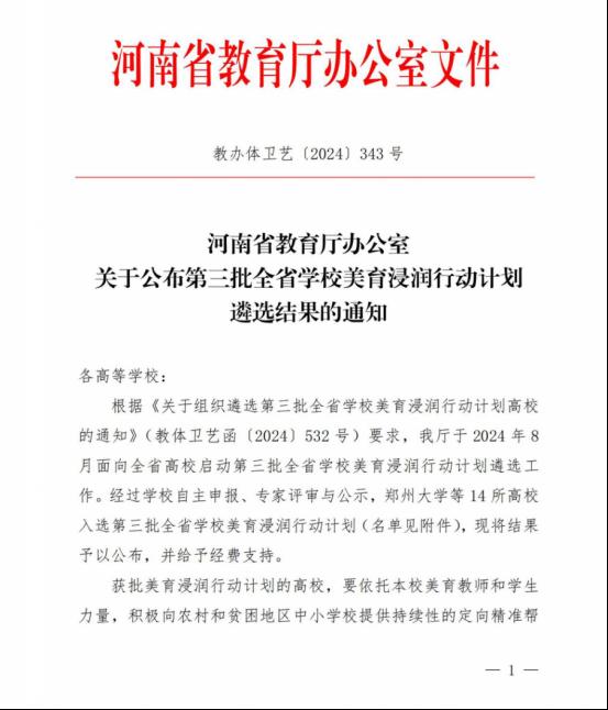 近日,河南省教育厅公布了第三批全省学校美育浸润行动计划入选名单,经学校自主申报、专家评审与公示,金年会成功入选。
