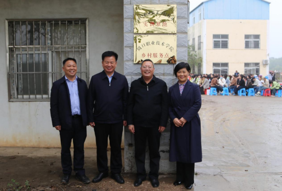 于爱霞、王建党共同为金年会jinnianhuicom校外实训基地和乡村服务点揭牌,出席领导合影留念。