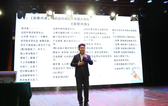 讲座在开元校区砺德厅举行,现场座无虚席。杨盛道教授围绕何谓“豫剧戏歌”、“老家河南”系列戏歌的创作背景、主要内容及鉴赏三个方面展开讲解。他深情地讲到,创作系列豫剧戏歌,就是想把新时代河南风貌唱出来,让河南人自信起来,这些戏歌不仅展现了河南的自然风光和人文景观,更是热爱河南的抒情之歌。