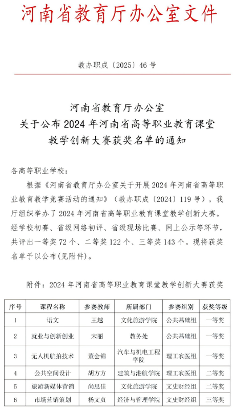 近日,河南省教育厅公布了2024年河南省高等职业教育课堂教学创新大赛获奖名单。金年会6名参赛教师全部获奖,其中荣获一等奖3项、二等奖2项、三等奖1项。