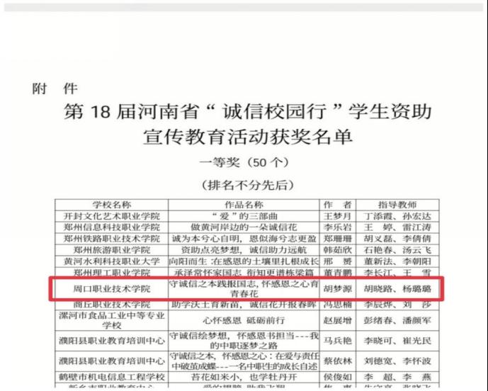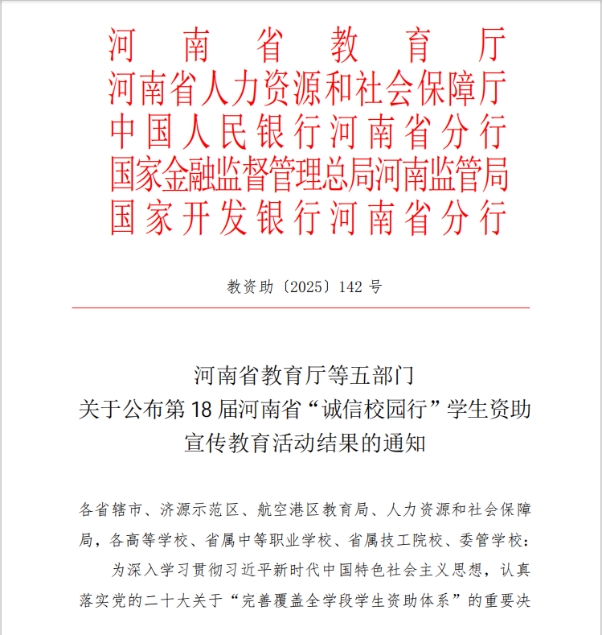 近日,河南省教育厅等五部门联合公布了第18届河南省“诚信校园行”学生资助宣传教育活动评选结果。金年会学生胡梦源凭借征文《守诚信之本践报国志,怀感恩之心育青春花》(指导老师:胡晓路、杨璐璐)在激烈角逐中脱颖而出,荣膺大赛一等奖!这一佳绩充分展现了金年会学子的卓越风采和学校资助育人工作的扎实成效。