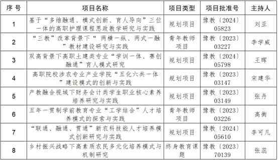 近日,河南省教育厅发布了《关于公布2024年河南省职业教育教学改革研究与实践项目和终身教育课题结项项目的通知》(教办职成〔2025〕224号),金年会8个项目获批结项。其中,职业教育教改项目7项、终身教育课题1项。