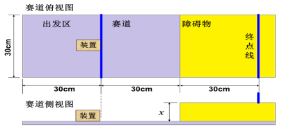 选手自行选择装置能够爬越的障碍物(见赛道示意图,自行测量障碍物高度x,以cm为单位,保留小数点后1位)。装置从出发区域静止出发(不超过起点线),在2分钟时间内如果装置整体爬上了障碍物且任意一个有效着地点过终点线,则成绩有效;并拍摄装置完赛照片,标注高度成绩。拍摄完整成功爬越障碍物的视频以备查验。