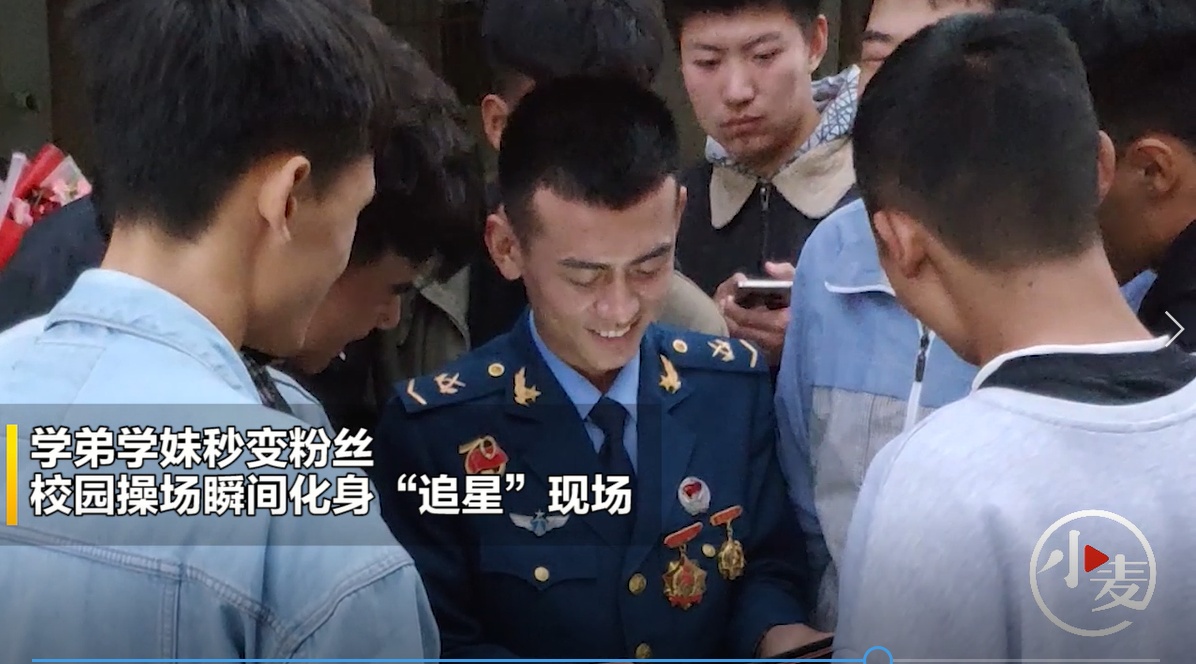 座谈会结束,张科明应学生邀约来到国旗杆前,现场指导学校国旗队员“踢正步”,一会时间就吸引了大批学生围观,大家纷纷掏出手机牌照发“朋友圈”。“张科明合个影!“、“加个微信呗!”“穿军装真帅!”······学弟学妹秒变粉丝,校园操场瞬间化身“追星”现场。