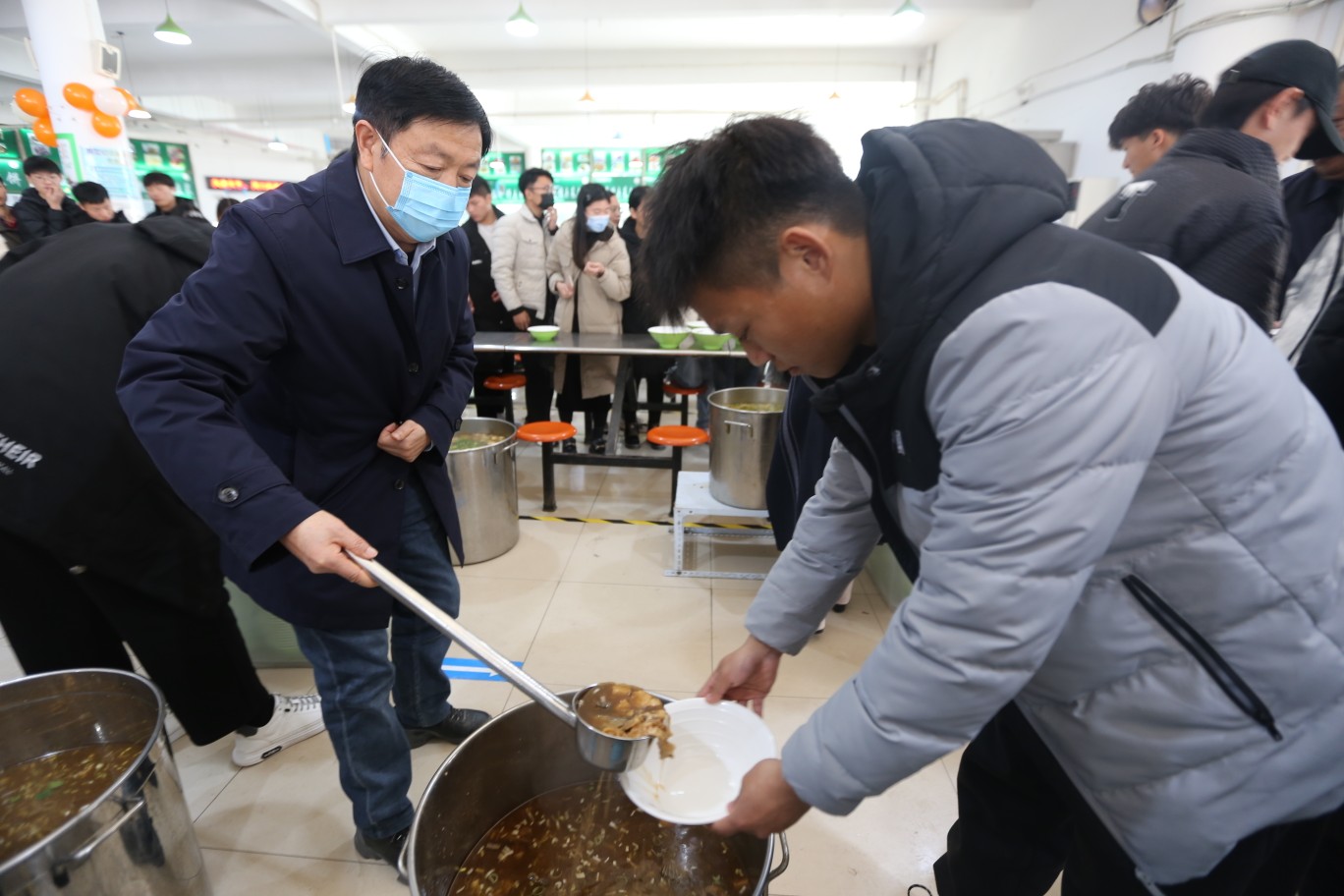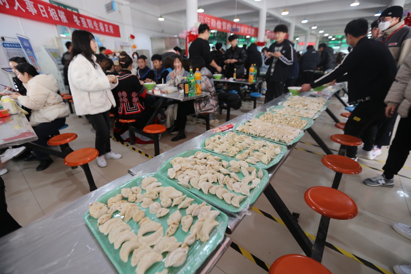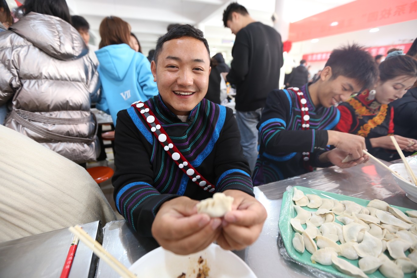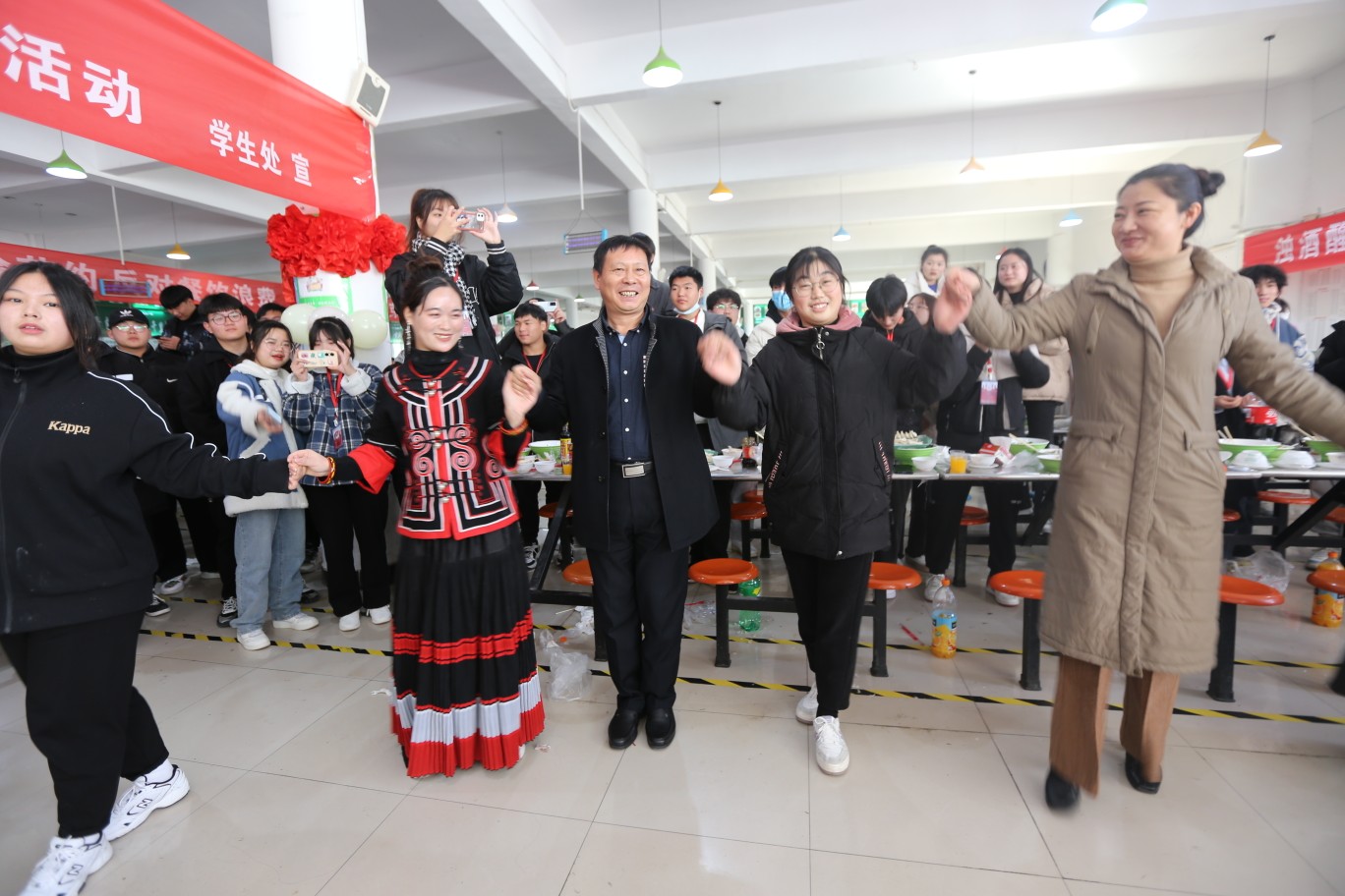 中午时分,学校党委书记刘士欣、校长李清臣等校领导,专门抽出时间来到学生食堂,和同学们一起动手包饺子、跳彝族舞蹈,把学校浓浓的节日关爱之情,送到学生中间。